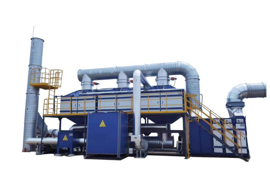 有机废气首先经过已经“蓄热”的高温陶瓷填充层进行预热,蓄热陶瓷由高热传导系数材料制成具有良好的热交换特性。预热后的有机废气通过燃烧室加热到250℃左右,在催化剂的作用下迅速氧化并生成无害的CO2和H2O,同时释放大量热量。