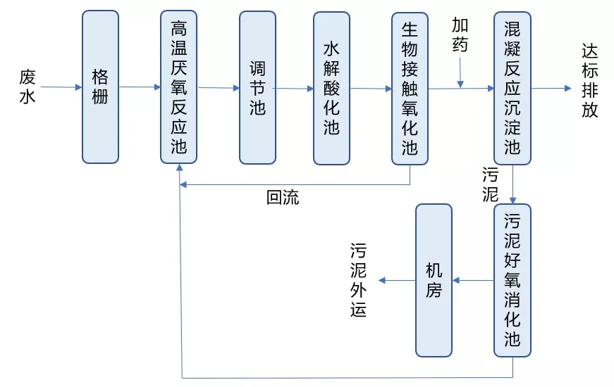 (2)高温厌氧反应池。经过格栅处理的废水流入高温厌氧反应池,再将处理后的水经反应池顶部的排水管流入调节池。高温厌氧反应池用高温水废水高温厌氧发酵预处理发酵过程可以有效地降低废水的色度,提高废水的生物降解性,温度下降几小时后废水生物接触氧化池的水循环,从而实现废水生物接种的水稀释废水中污染物的浓度,减少水处理的难度,降低运行成本,确保出水符合标准。