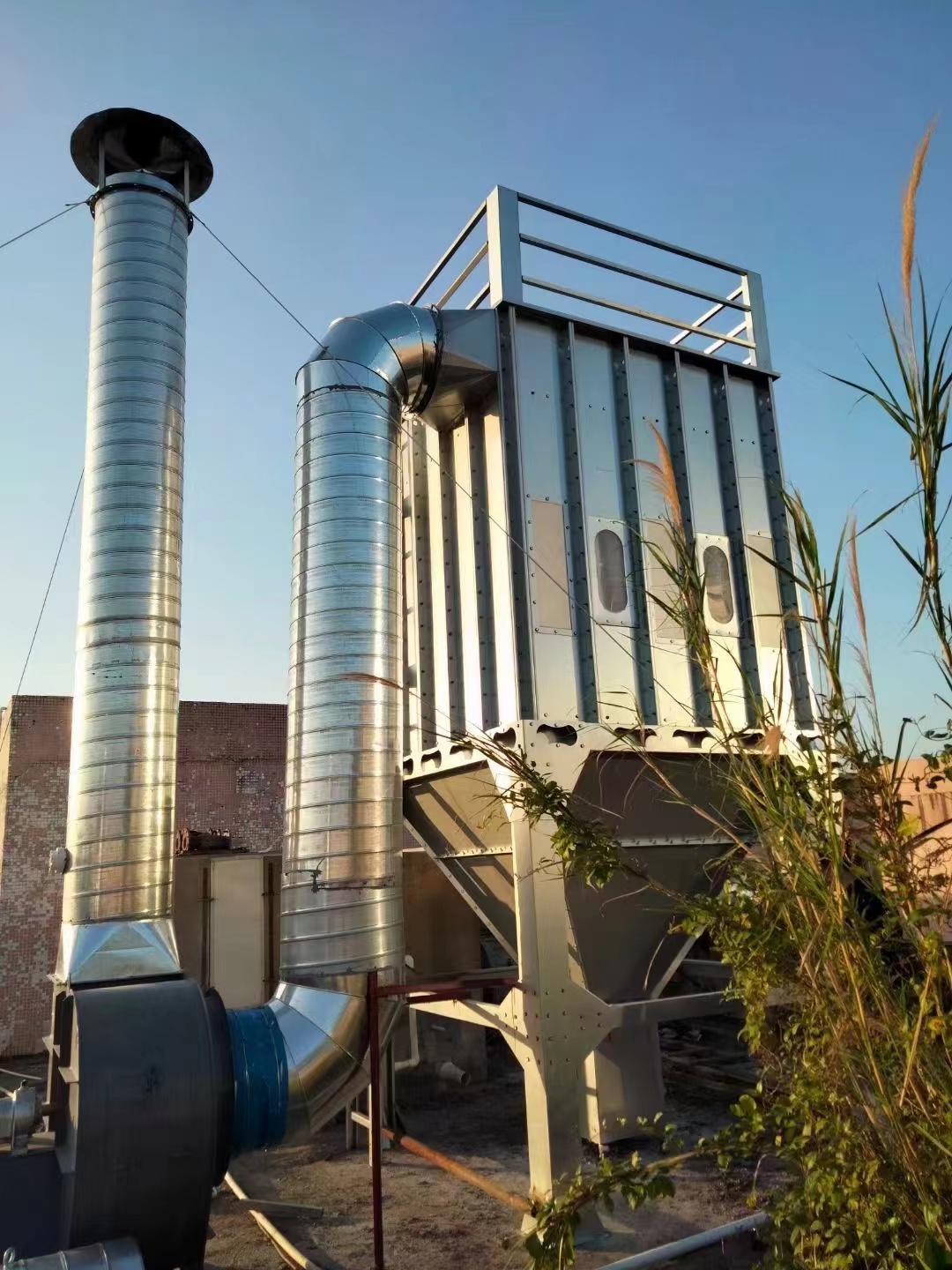 含尘气体从袋式除尘器进口引入后,通过烟气分配装置均匀进入滤袋,在此过程中粉尘即被滤袋的外侧所阻挡,经过净化处理的气体从出口排出,粉尘则附着在滤袋外表面上,当粉尘达到一定厚度时,电磁脉冲阀开启,压缩空气从滤袋出口处的文丘里喷嘴自上而下吹入滤袋,将吸附在滤袋外表面的粉尘清落到下面的灰斗中,然后由回转排灰阀将粉尘排出,文丘里喷嘴可以 诱导大量的刚被净化的气体进入袋中,其体积数倍于喷嘴喷出的压缩空气,而且流速很高,形成空气波,使滤袋口至底部发生急剧膨胀和冲击振动,具有很强的清灰效果。