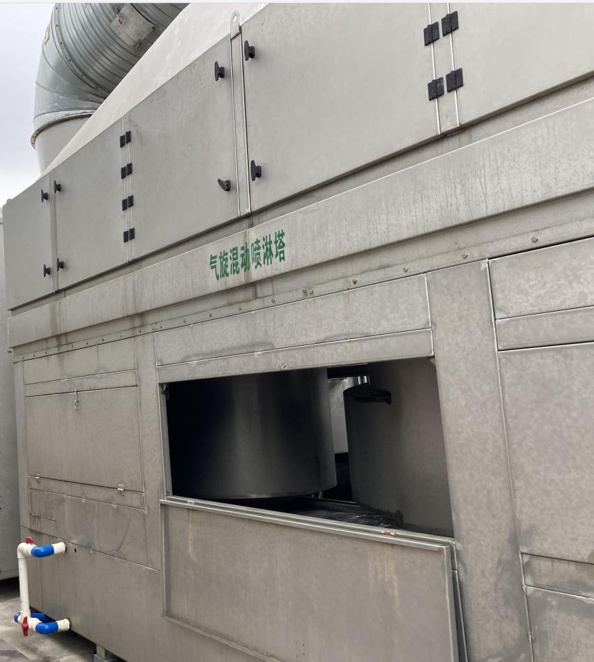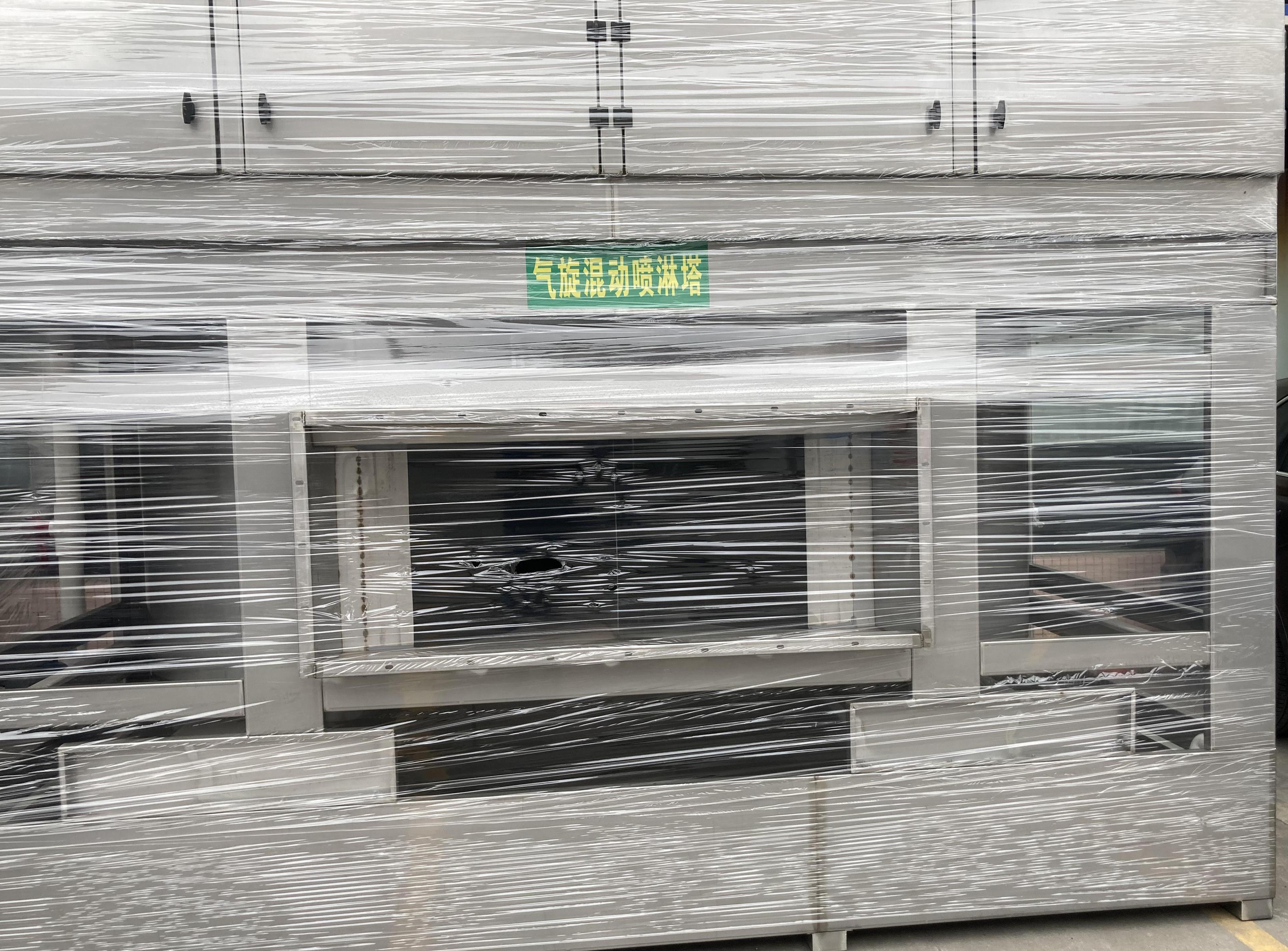 原理简述:气旋喷淋塔在离心力作用下,含尘气体呈横向向心运动,含尘气体停留时间更长,洗涤效果更好,彻底改善了喷淋塔在某些特定工况下存在的除尘不彻底、水喷淋塔容易堵塞等技术缺陷。产品采用专利技术,避免水泵及喷头的堵塞,大大提高生产效率,其中水池的水可循环使用,避免产生二次污染造成的困扰,更节约了水资源。气旋塔内安装有1个或2个“圆形旋流桶”和高效除雾板。旋流桶内放有实心填料球,上层的除雾板用来净化水雾,达到脱水雾的目的,含尘气体在塔内旋流上升、并在各板上与由塔顶进入的液体旋流接触,完成除尘任务;通过离心力的作用,废气中的大颗粒沉入水池, 由人工捞出清理机壳,这样气体得到净化,同时气旋塔内的水可以继续循环使用。
